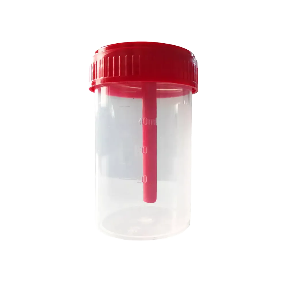 Stuhlsammelbehälter, ca. 40 ml, transparent roter Schraubverschluss, integrierter Entnahmelöffel Behälter aus PP, Deckel aus PE VE= 250 Deckel und 250 Becher im PE Beutel Palette= 24 Krt.